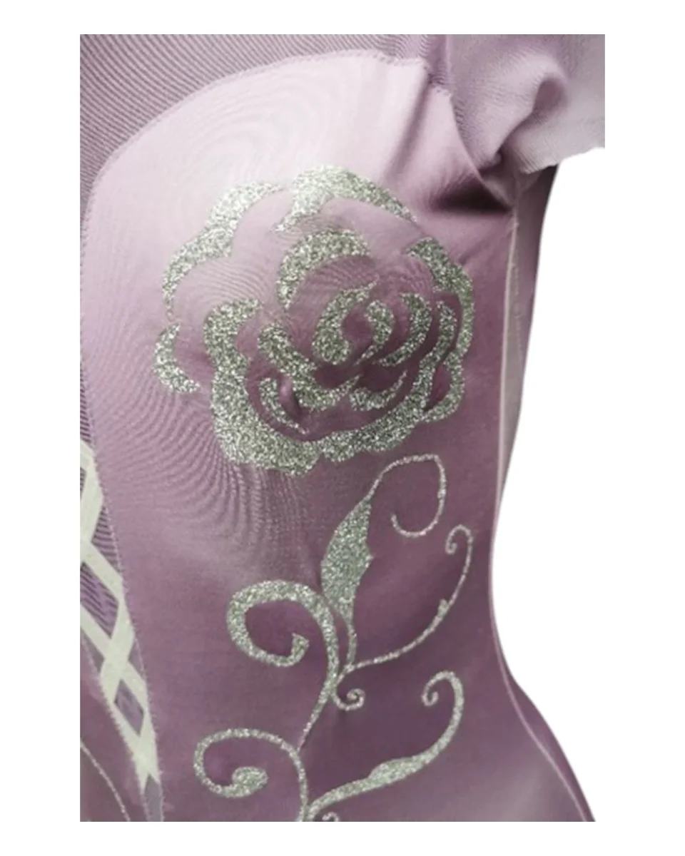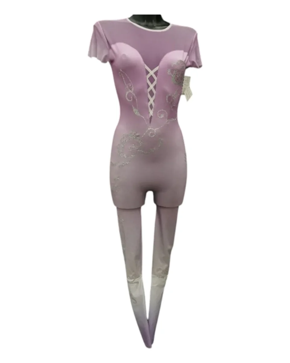 Questa tuta in Lycra sfumata, che passa delicatamente dal lilla al bianco, è arricchita da una rete lilla che aggiunge leggerezza e trasparenza elegante. Il corpetto presenta uno scollo a cuore, impreziosito da un nastro di raso bianco che dona un tocco raffinato e femminile.