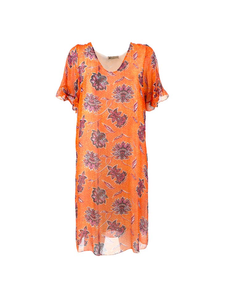 Vestito corto in chiffon misto seta stampato, modello ampio, con scollo tondo e maniche corte. Fodera interna a canotta in tinta unita color giallo zafferano. Targhetta Karakorum in metallo.