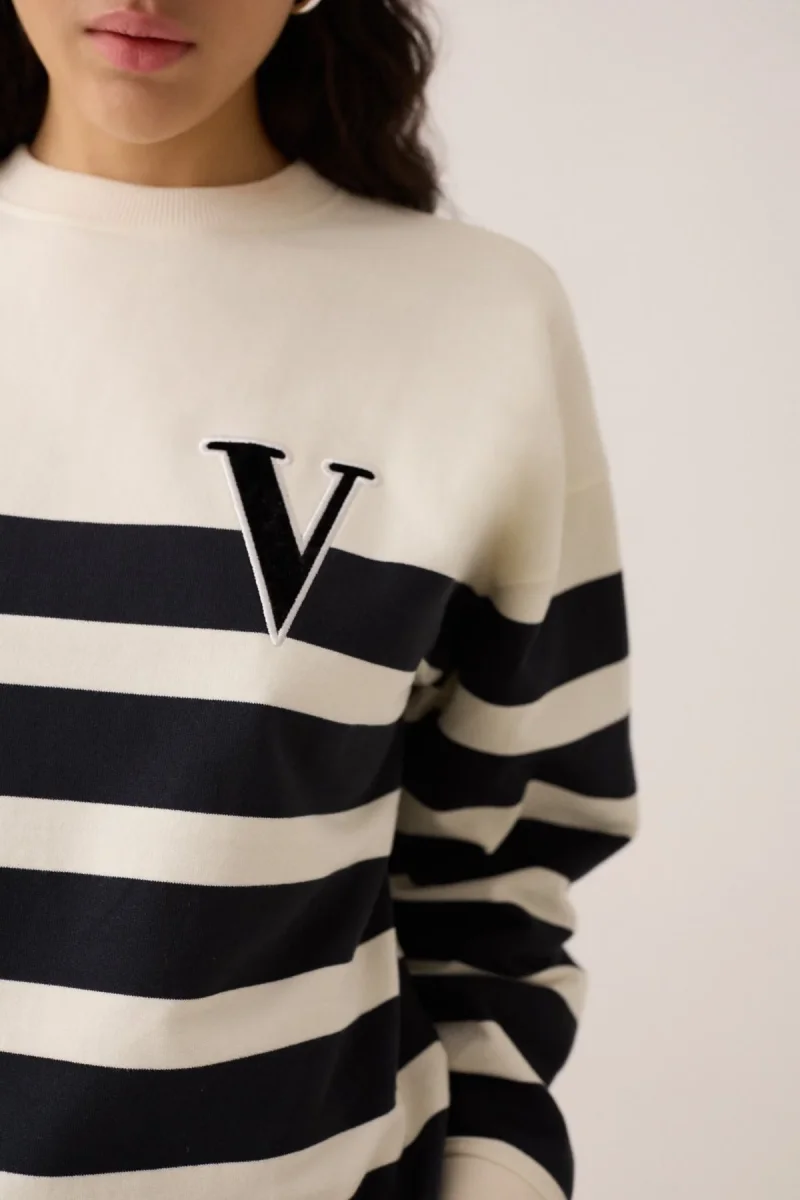 Introducing the oversized Vogue Sweatshirt in Black Cream Striped with a luxurious Velvet Patch. This loose, cropped fit sweatshirt features high-quality logo embroidery and an open edge for added flair. It’s GOTS certified for sustainability. For a figure-hugging look, consider choosing one size smaller. Elevate your style with our captivating sweatshirt.