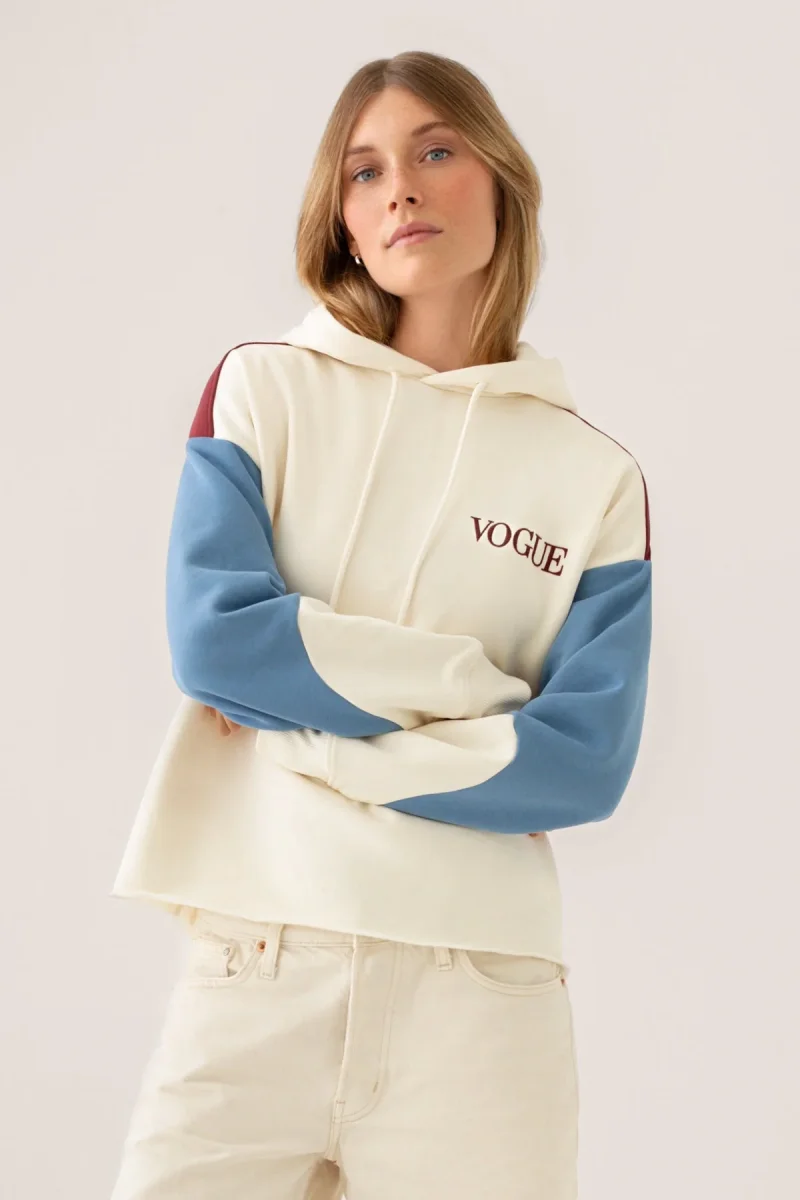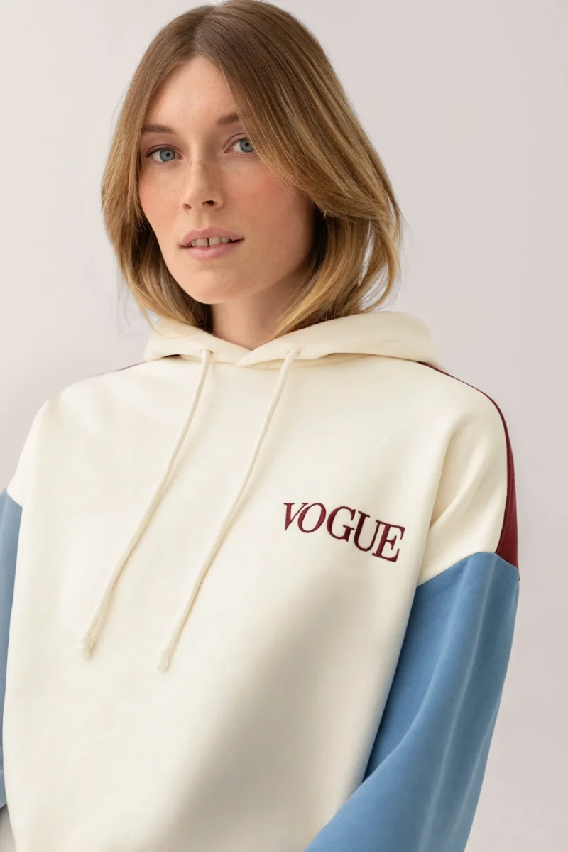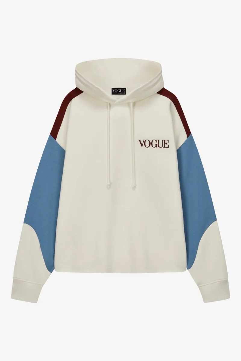 VOGUE Hoodie in cream with panel details in burgundy and blue and small logo embroidery, made from 100% organic cotton.
