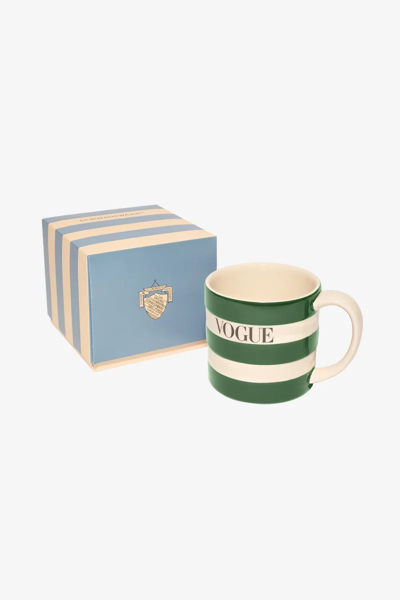 VOGUE mug with striped pattern and logo in green. The VOGUE mug is made in UK. – 0.44 l: Height: 9.5 cm, Volume: 443 ml – Microwave, dishwasher, and oven safe (up to 225ยบC) Discover the VOGUE mug in other colors and sizes.