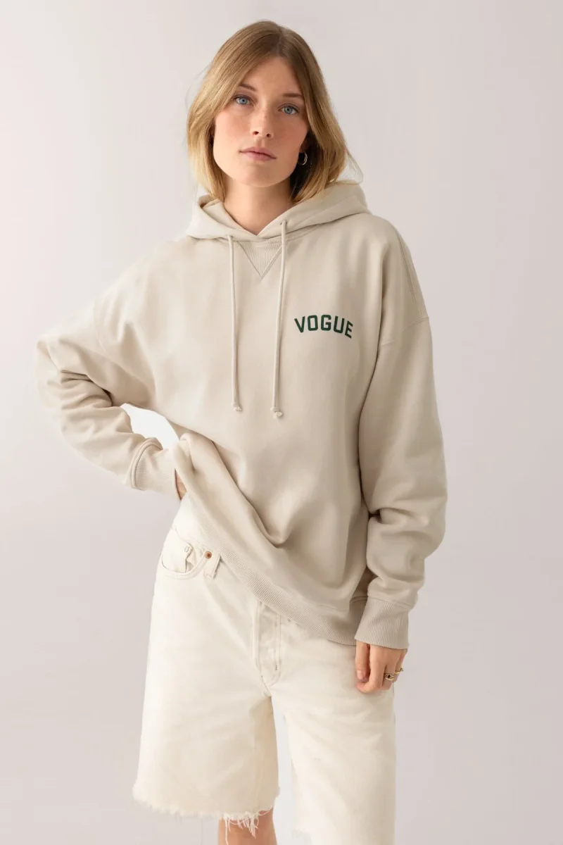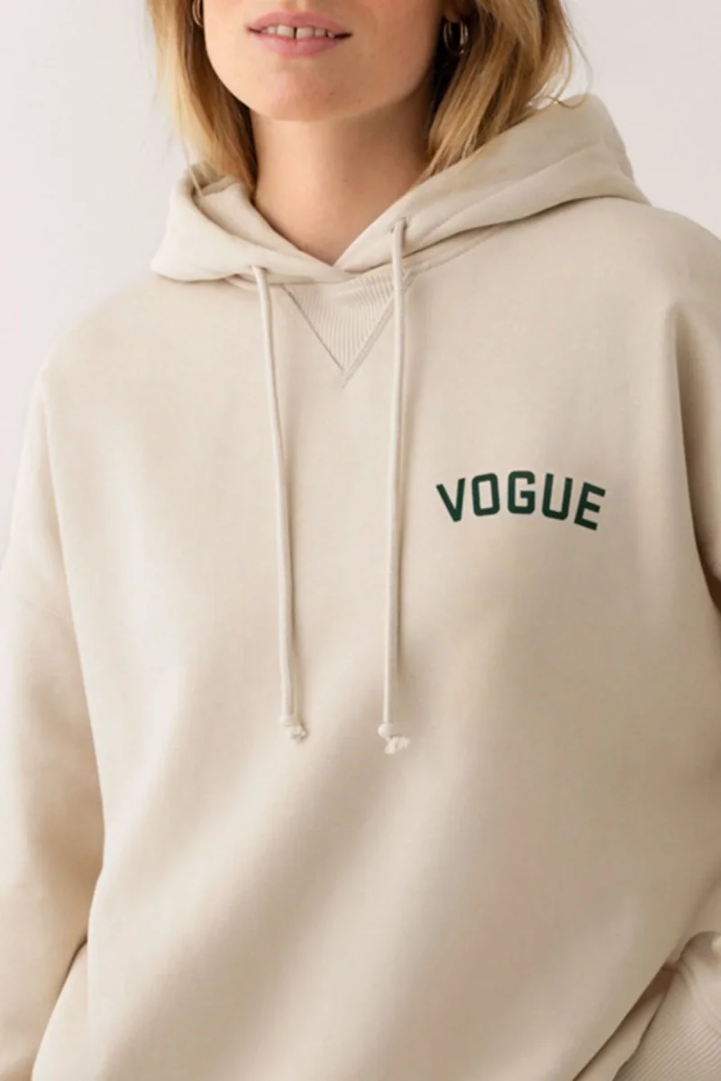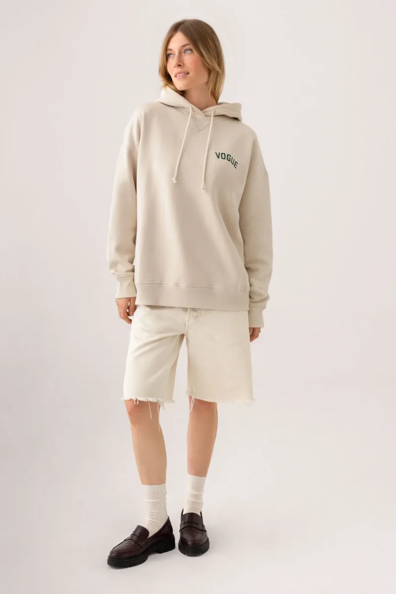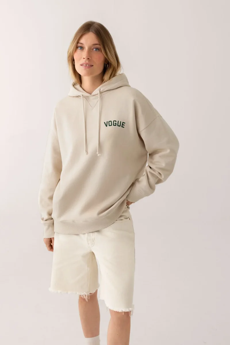 Oversize VOGUE Hoodie in ecru with small logo print in green, made from 100% organic cotton.