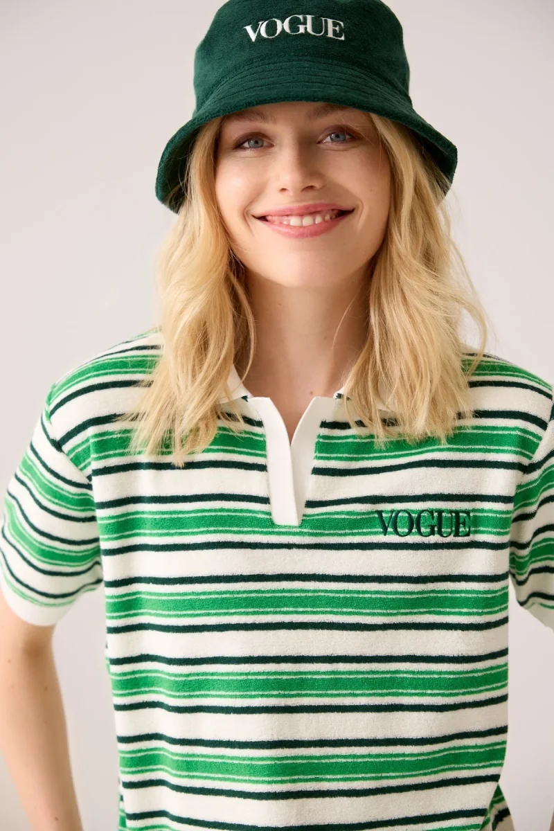 Get ready to make a stylish statement with our Vogue polo shirt in cream, featuring captivating green stripes and high quality logo embroidery. Designed with a loose, cropped fit, this polo shirt is the perfect blend of comfort and trendiness. The ribbed polo collar and cuffs are made with terry cotton of exceptional quality. This polo shirt is GOTS certified, guaranteeing its commitment to sustainability. The model confidently wears size S, and for a coordinated ensemble, we recommend pairing the polo shirt with the matching shorts and bucket hat. Get your hands on the Vogue Polo Shirt in Striped Blue.
