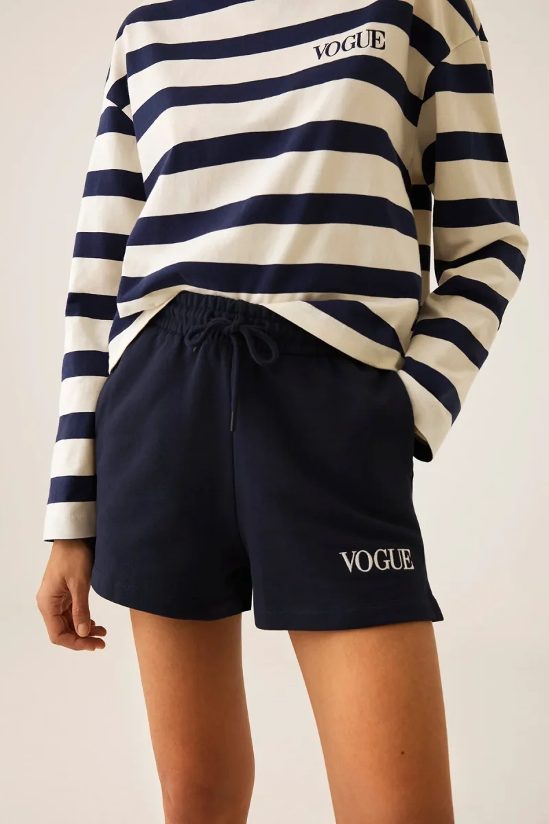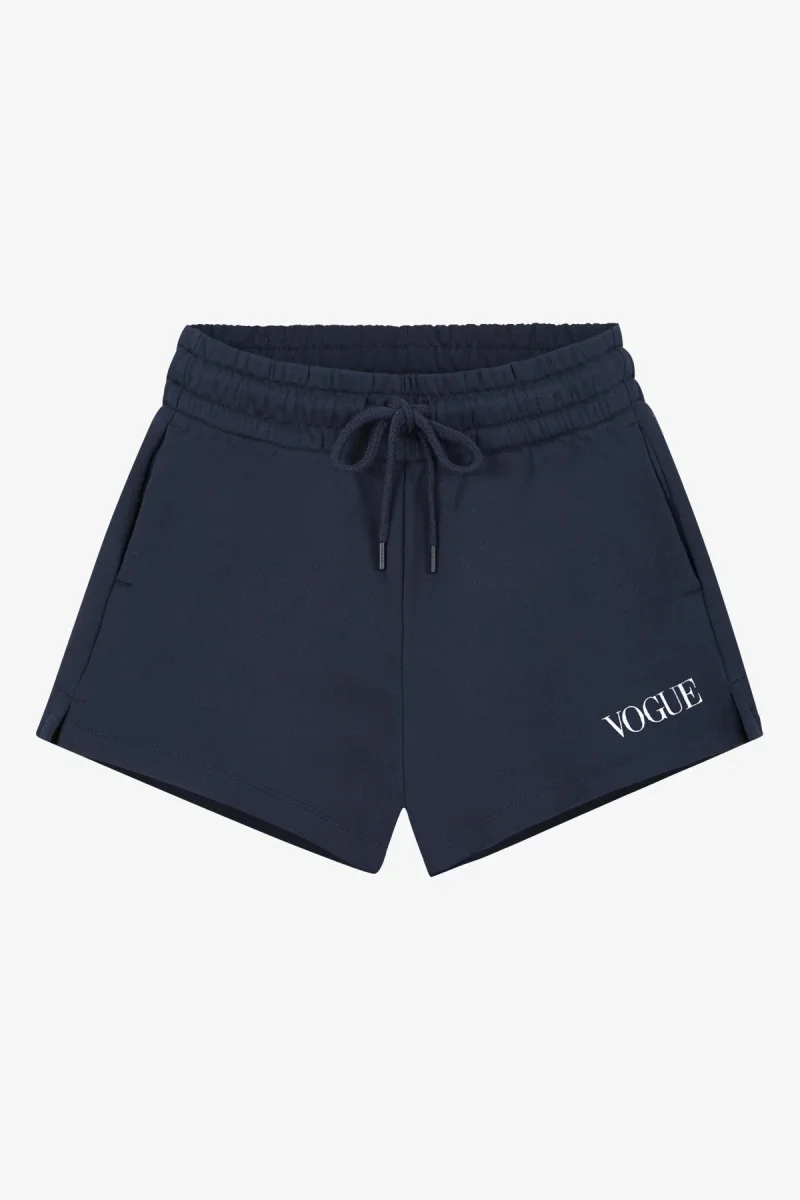 VOGUE Shorts in navy with logo embroidery in cream, made from 100% organic cotton.