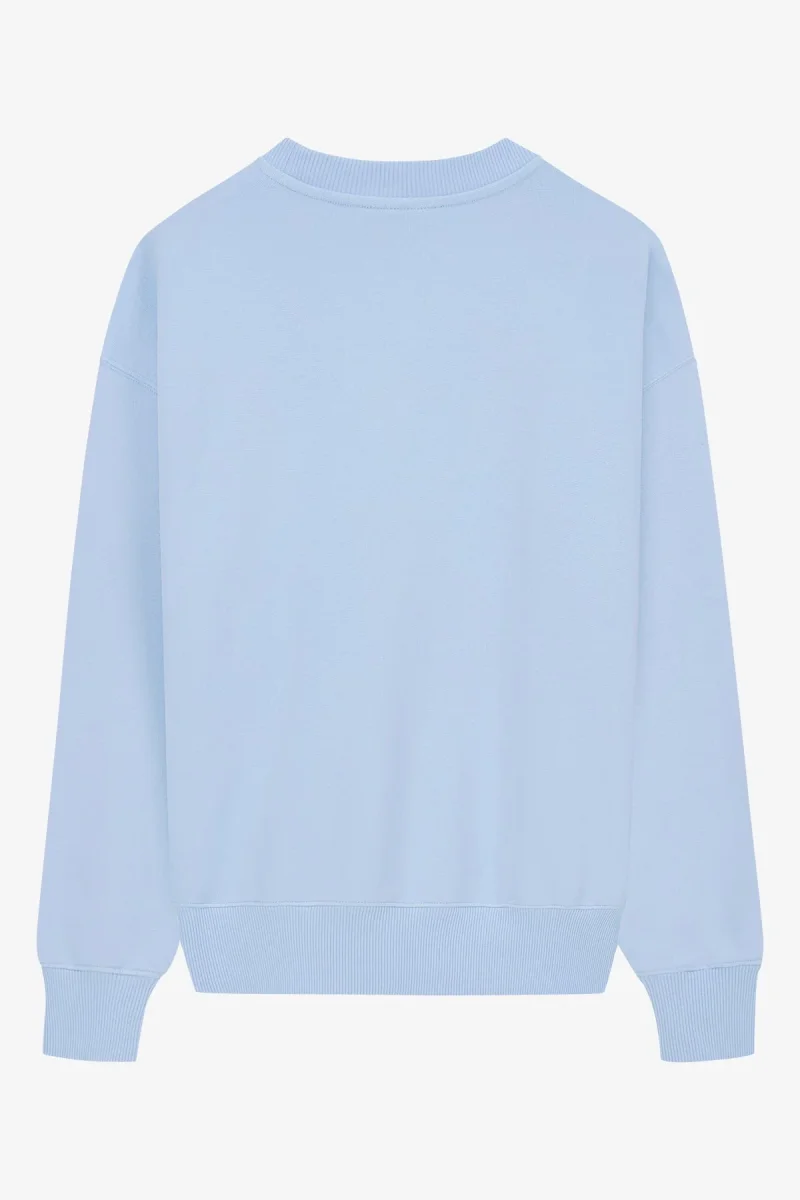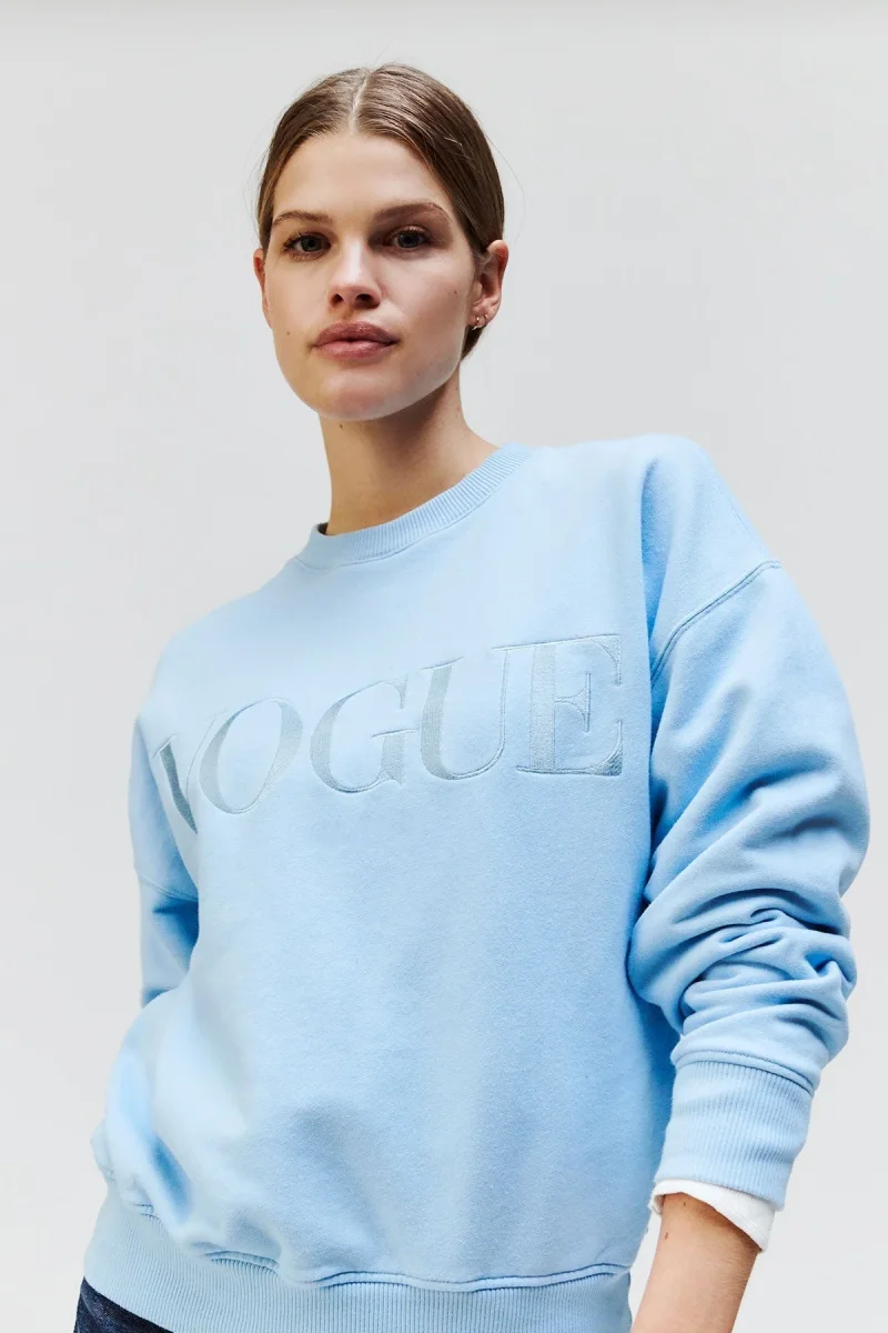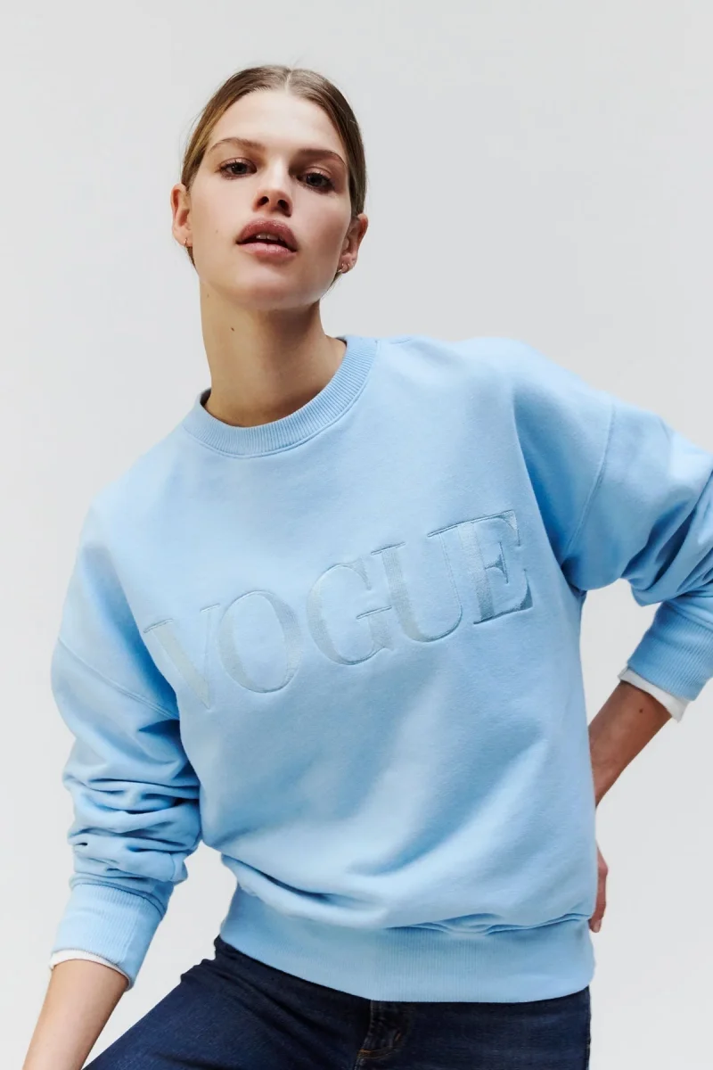 Oversized Vogue sweatshirt in light blue with tonal logo embroidery made of 100% organic cotton. The Vogue sweater with oversized shoulders and soft cotton quality is sustainably and fairly produced in Portugal. FREE UK delivery for orders over ยฃ125!