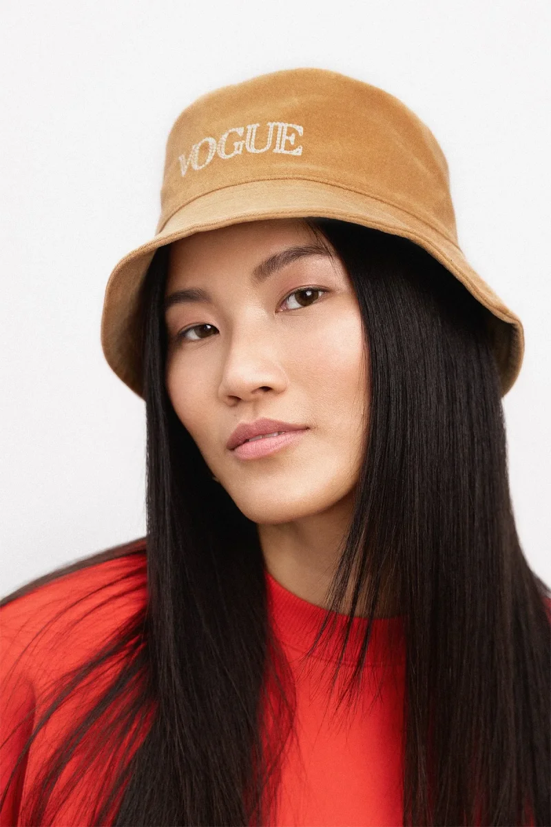 VOGUE Cap velvet bucket hat in camel with logo embroidery, made from 100% organic cotton. The VOGUE bucket hat, made from high-quality cotton, is ethically produced in Portugal. – High-quality cream-coloured logo embroidery with a handcrafted look– One size Combine the Cap with the matching VOGUE Sweatshirt or Hoodie in camel.