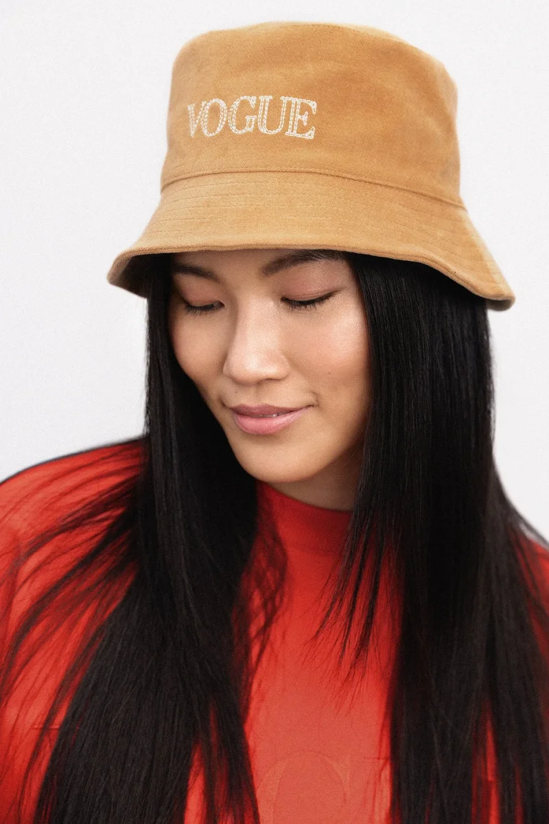 VOGUE Cap velvet bucket hat in camel with logo embroidery, made from 100% organic cotton.